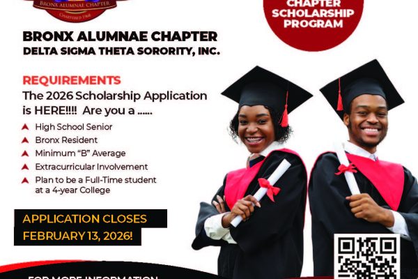 November 1, 2024 Posted By: Jakoya Grissett NewsCurrently, Bronx Alumnae Chapter awards one (1) four-year scholarship in the amount of $10,000, dispersed at $1,000 per semester, to a high school senior who is a resident of the Bronx and maintains each semester in college an overall 3.0 GPA on a 4.0 scale. In addition, we award several one-time...