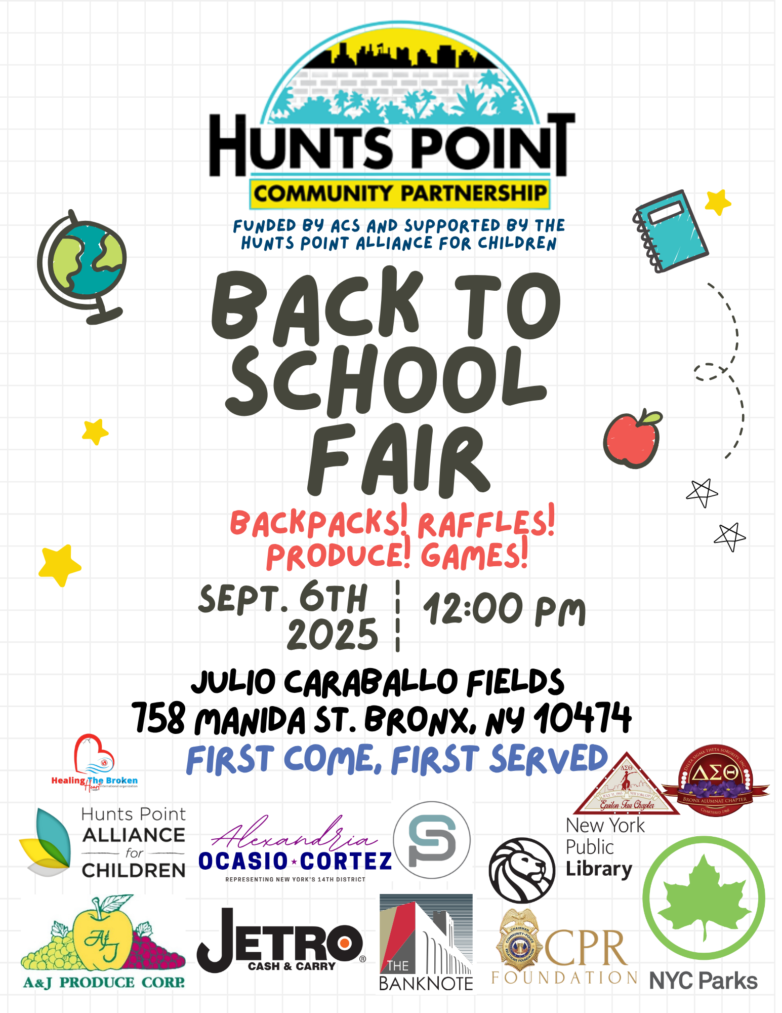 We are proud to partner with the Hunts Point Community Partnership, Congresswoman Alexandria Ocasio-Cortez, the New York Public Library, and more to support families and students as they prepare for a successful school year.