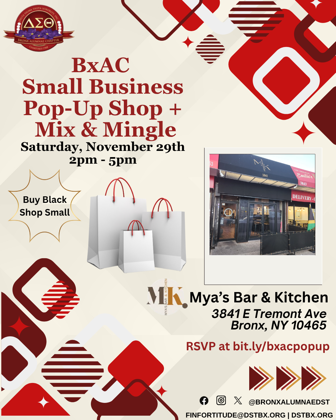 Join the Bronx Alumnae Chapter for our Small Business Pop-Up Shop + Mix & Mingle on November 29th at Mya’s Bar & Kitchen.